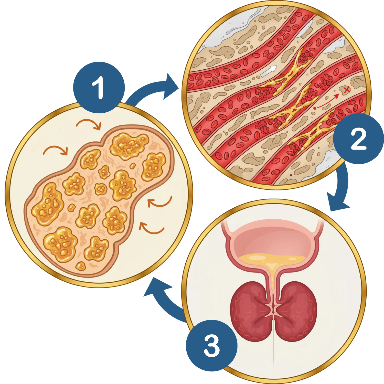 Compuestos potentes descomponen años de residuos acumulados, reabren los vasos sanguíneos e inundan la próstata con sangre rica en oxígeno. La inflamación se calma y comienza la curación.